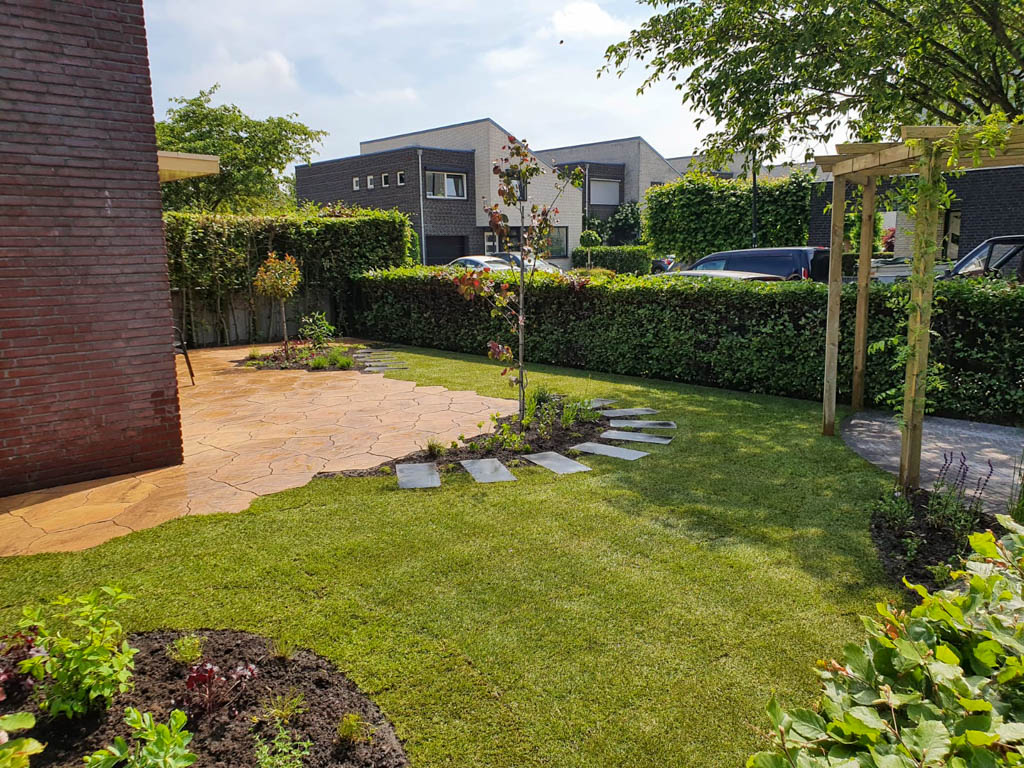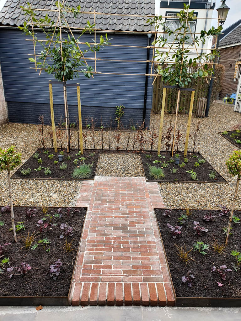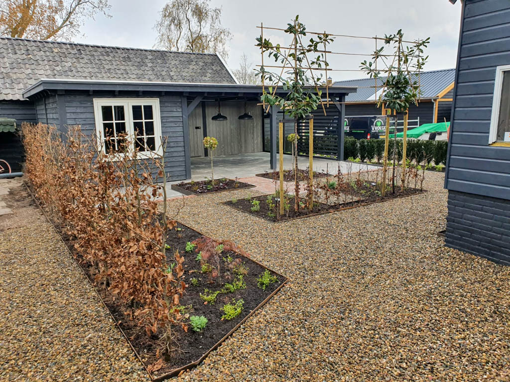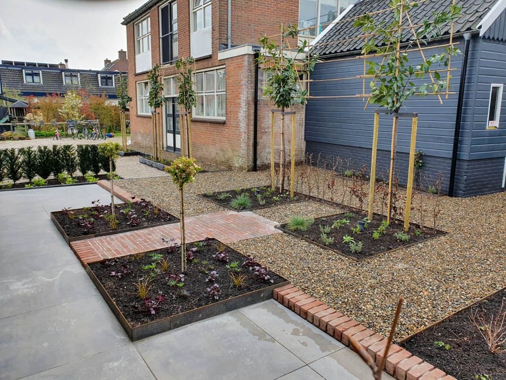 De tuinaanleg gebeurt conform het ontwerp. In grote lijnen komt dit op het volgende neer: