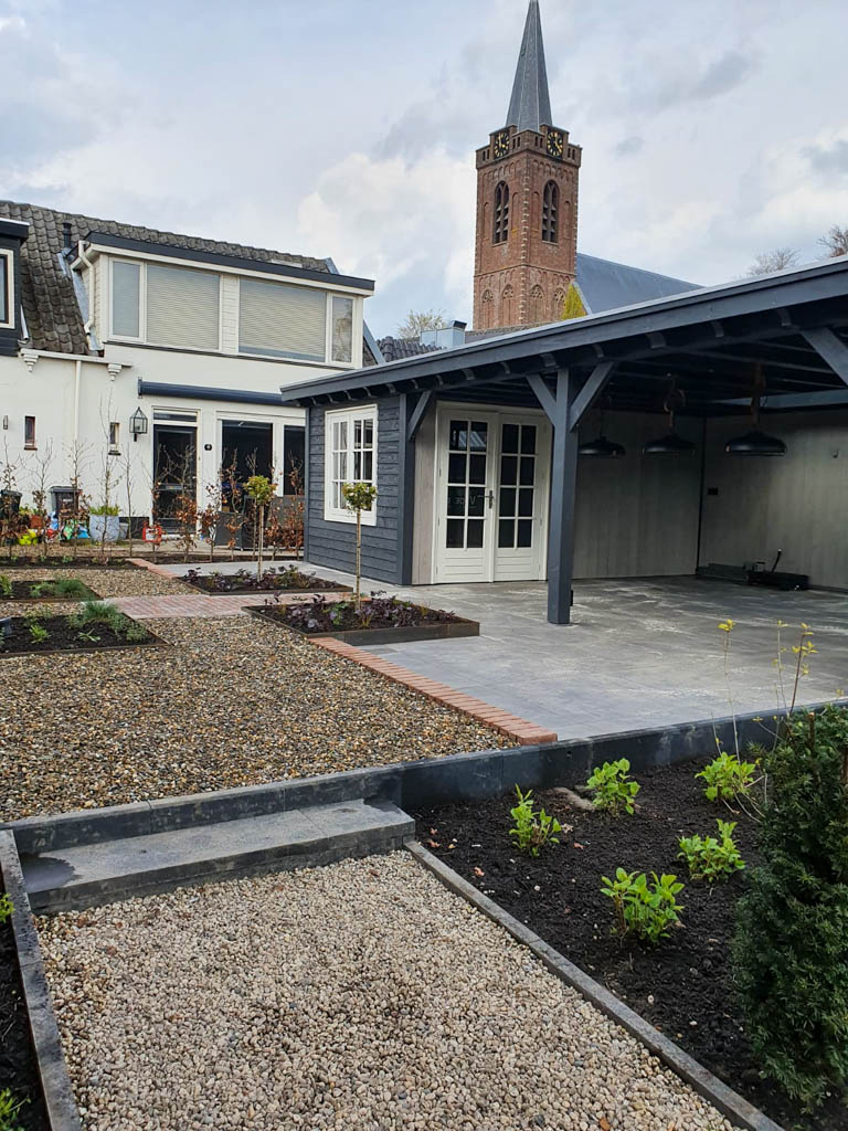 - het verwijderen en op een milieubewuste wijze verwerken van de oude tuinmaterialen;