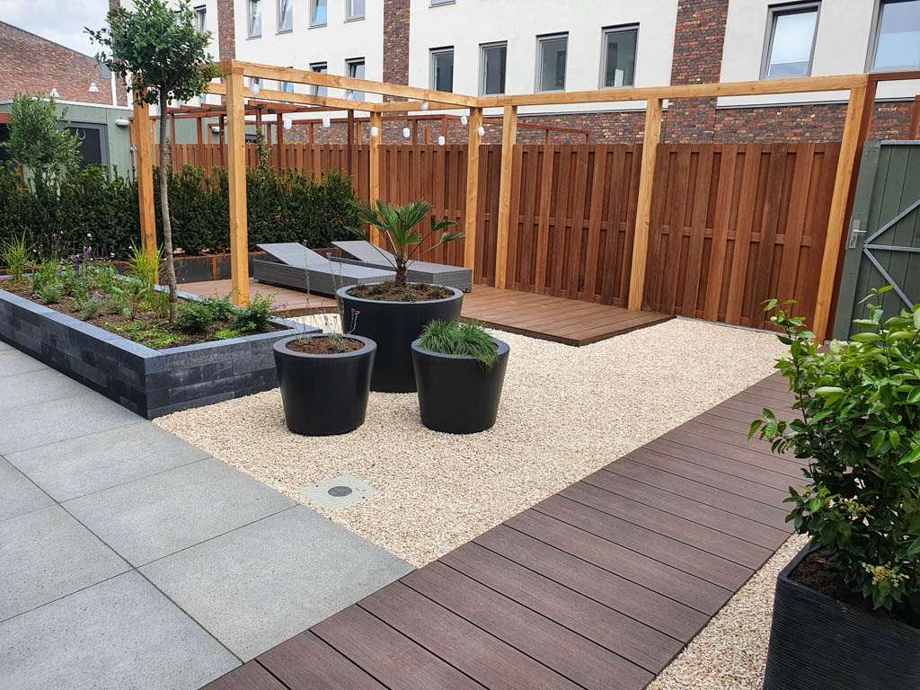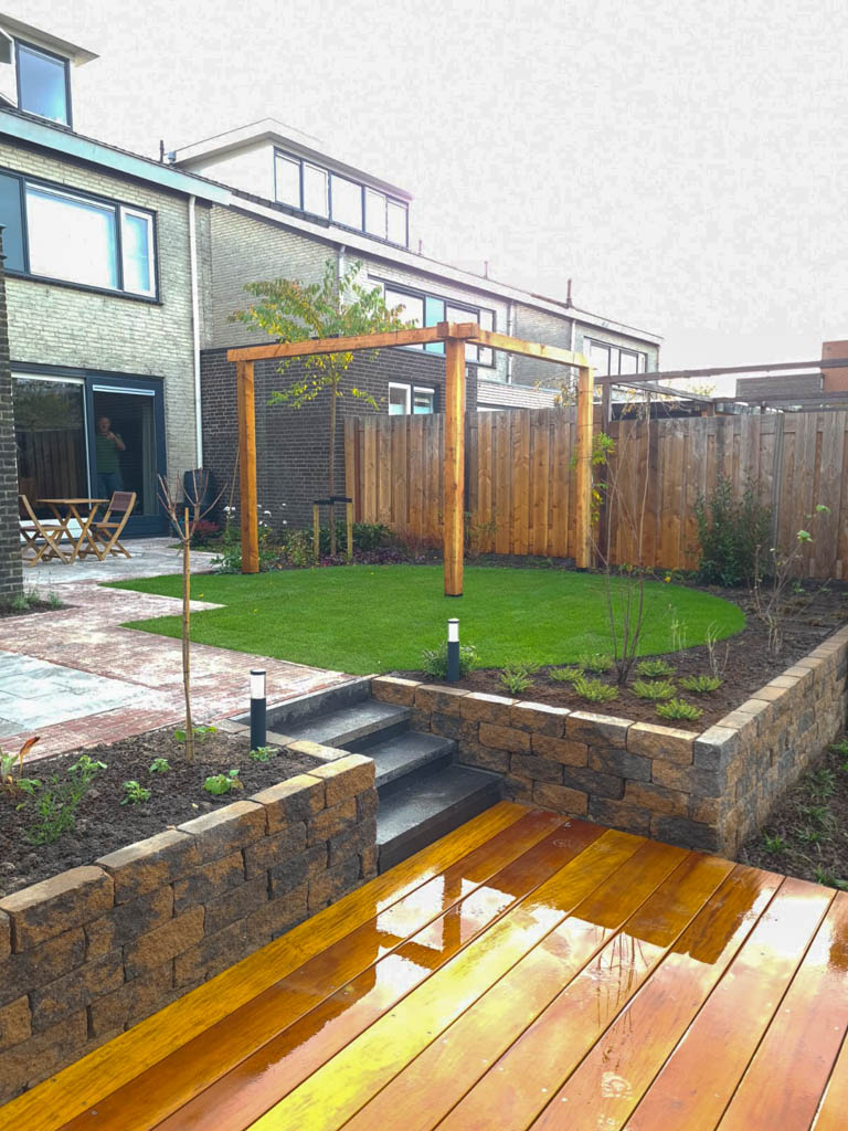 overkappingen, tuinafscheidingen, vijvers, vlonders, beschoeiingen, tuinhuisjes en het aansluiten van de verlichting; - het aanbrengen van beplanting, bemesting en (eventueel) het gazon.