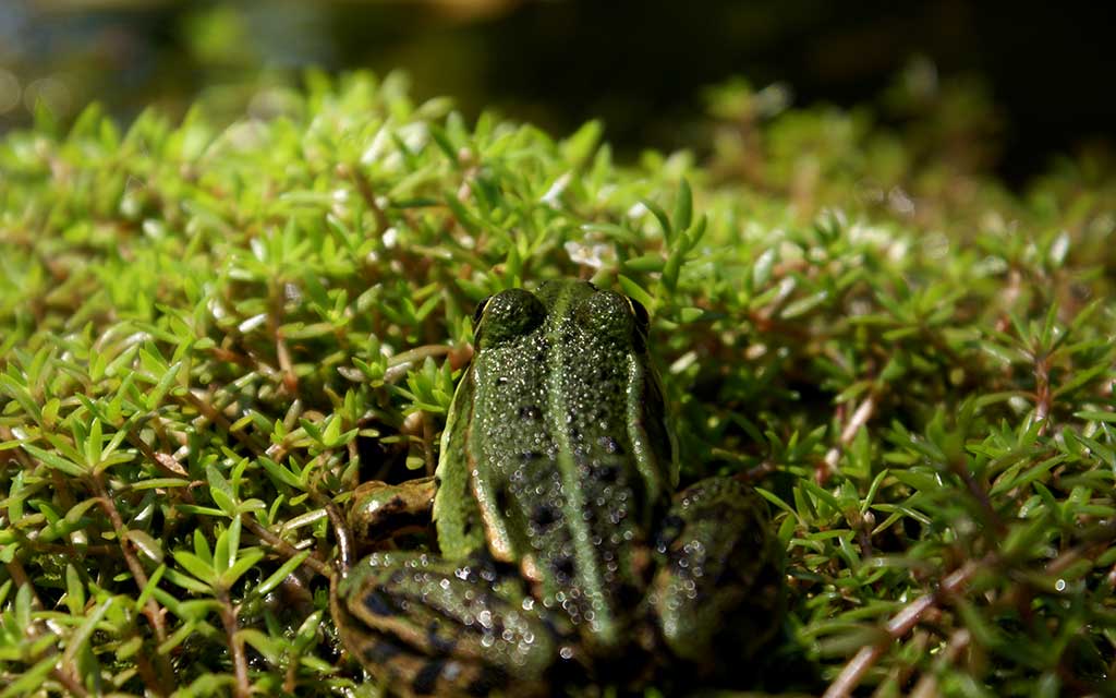 Een tuin waarin gazon, beplanting, dieren/insecten een belangrijke rol spelen.