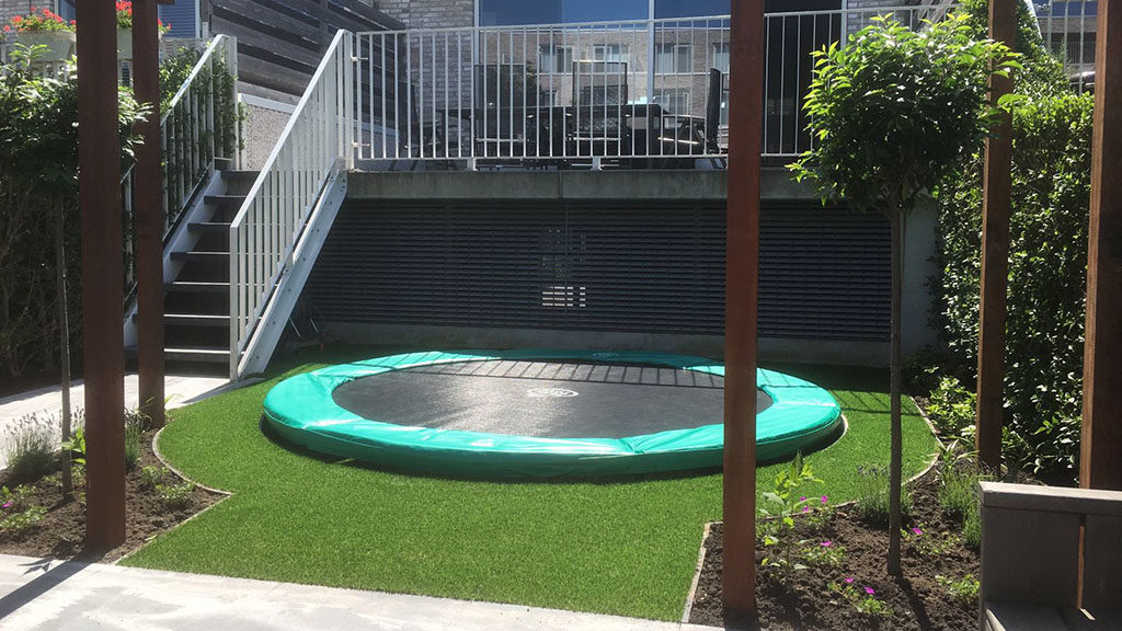 Een tuin die ingericht is op het vermaak en de veiligheid van kinderen.
